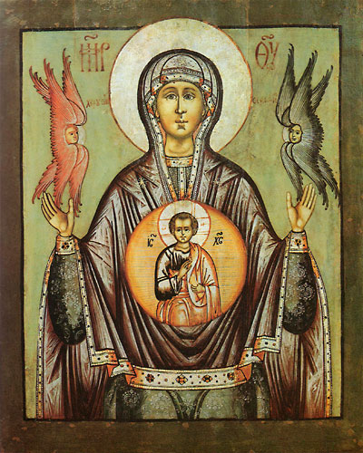 широко распространенное изображение Богоматери, основанное на важнейшем из пророчеств Исайи, неоднократно приводимом в новозаветных текстах: «Сам Господь даст вам знамение: се Дева во чреве примет и родит Сына, и нарекут имя Ему: Еммануил» (Ис 7, 14). Представляет поясной образ молящейся Богоматери с поднятыми и раскинутыми в стороны руками (Оранты), несущей на груди изображение Младенца Христа-Эммануила (обычно в круглом медальоне), правой рукой благославляющего мир, а в левой держащего свиток, знак спасительного учения. Само наименование «Знамение» известно только на Руси и, очевидно, связано с приведенным библейским текстом: «Господь даст вам знамение...» Особую известность на Руси приобрела икона Богоматерь Знамение Новгородская (память 27 ноября / 10 декабря). |