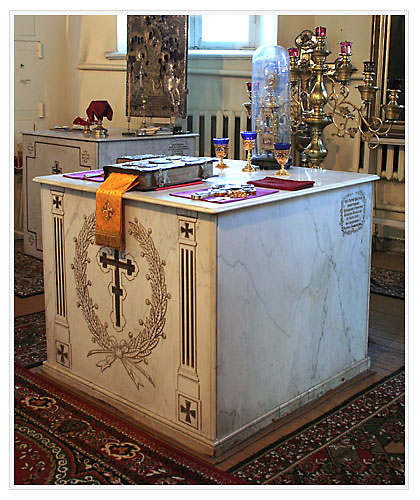 четвероугольный стол посреди алтаря, освященный архиереем для совершения на нем Таинства Евхаристии. Делается из дерева или камня высотой около метра, облачается в две священные одежды – нижнюю (белое льняное покрывало), и верхнюю (светлый шелковый или парчевый плат). На престоле полагаются антиминс, напрестольное Евангелие, крест, дарохранительница и лампада. Как алтарь есть самое священное место в храме, так и престол является самым священным местом в алтаре, на нем таинственно присутствует Слава Божия. Поэтому прикасаться к престолу и проходить перед ним (между престолом и Царскими вратами) имеют право только священнослужители. |